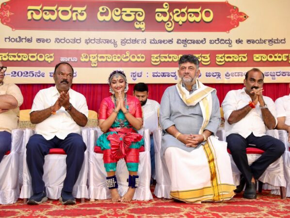 ಭರತನಾಟ್ಯ ಸಾಧಕಿಗೆ ಗೋಲ್ಡನ್‌ ಮುಕುಟ ಲಭಿಸಿದ್ದು ಹೆಮ್ಮೆ: ಡಿಕೆಶಿ216 ಗಂಟೆಗಳ ಕಾಲ ನಿರಂತರ ಭರತನಾಟ್ಯ ಪ್ರದರ್ಶನ ಮಾಡುವ ಮೂಲಕ ವಿಶ್ವದಾಖಲೆ ಬರೆದ ವಿದುಷಿ ದೀಕ್ಷಾ ವಿ. ಅವರನ್ನು ಉಡುಪಿಯ ಅಜ್ಜರಕಾಡಿನ ಮಹಾತ್ಮ ಗಾಂಧಿ ಜಿಲ್ಲಾ ಕ್ರೀಡಾಂಗಣದಲ್ಲಿ ನಡೆದ ಸಮಾರಂಭದಲ್ಲಿ ಸನ್ಮಾನ ಮಾಡಲಾಯಿತು. ಉಡುಪಿ ಜಿಲ್ಲೆ ಬ್ರಹ್ಮಾವರ ತಾಲೂಕಿನ ಮುಂಡ್ಕಿನಜಡ್ಡು ಗ್ರಾಮದ ವಿದುಷಿ ದೀಕ್ಷಾ ವಿ. ಸಾಧನೆ ಪ್ರತಿಯೊಬ್ಬರೂ ಹೆಮ್ಮೆಪಡುವಂತದ್ದು. ಧೈರ್ಯ, ಇಚ್ಛೆ, ಸಂಕಲ್ಪದಿಂದ ಸಾಧನೆ ಮಾಡಿರುವ ನಾಟ್ಯ ಕಲಾವಿದೆಗೆ ಶುಭವಾಗಲಿ ಎಂದು ಡಿಕೆಶಿ ಹಾರೈಸಿದರು.