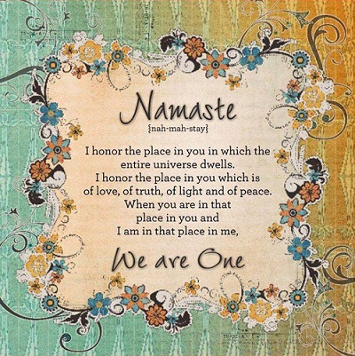 You also can perform Namaste by placing your hands together in front of your third eye (in the middle of your forehead), bowing your head and then bringing your hands down to your heart. Whereas in the West, we usually speak the word “Namaste” in conjunction with the gesture.