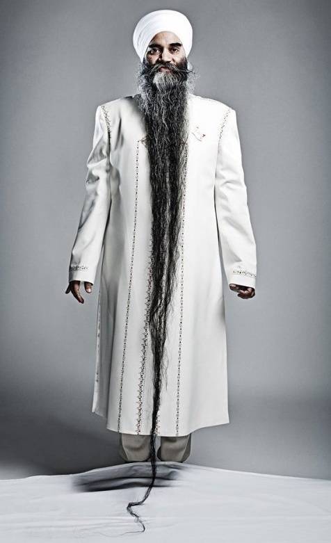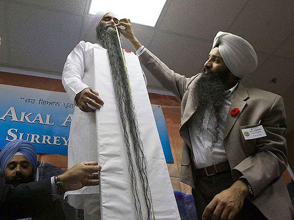 The longest beard measures 2.37 m (7 ft 9 in) and belongs to Sarwan Singh (Canada). It was measured on the set of Lo Show dei Record in Rome, Italy, on 4 March 2010.