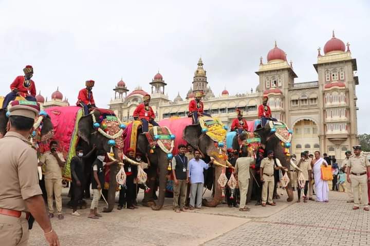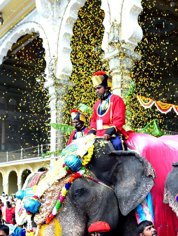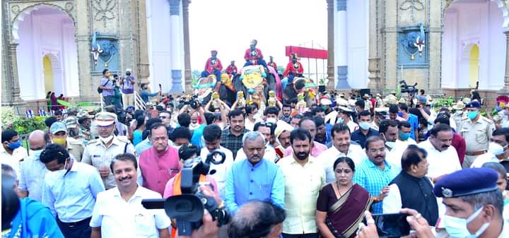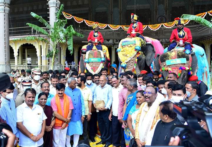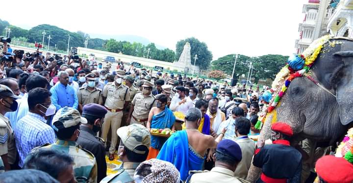 ಅರಣ್ಯ ಭವನದಿಂದ ಆಗಮಿಸಿದ ಗಜಪಡೆಗೆ ಅಂಬಾವಿಲಾಸ ಅರಮನೆಯ ಜಯಮಾರ್ತಾಂಡ ದ್ವಾರದ ಬಳಿ ಜಿಲ್ಲಾಡಳಿತದ ಪರವಾಗಿ ಜಿಲ್ಲಾ ಉಸ್ತುವಾರಿ ಸಚಿವ ಎಸ್.ಟಿ ಸೋಮಶೇಖರ್ ನೇತೃತ್ವದಲ್ಲಿ ಪ್ರಧಾನ ಅರ್ಚಕ ಡಾ. ಶಶಿಶೇಖರ್ ದೀಕ್ಷಿತ್ ಪುಷ್ಪಾರ್ಚನೆ ಮಾಡಿ, ಅರಮನೆ ಬ್ಯಾಂಡ್, ಮಂಗಳ ವಾದ್ಯ, ಪೂರ್ಣಕುಂಭ ಸ್ವಾಗತದ ಮೂಲಕ ಅರಮನೆ ಆವರಣಕ್ಕೆ ಸ್ವಾಗತಿಸಲಾಯಿತು.